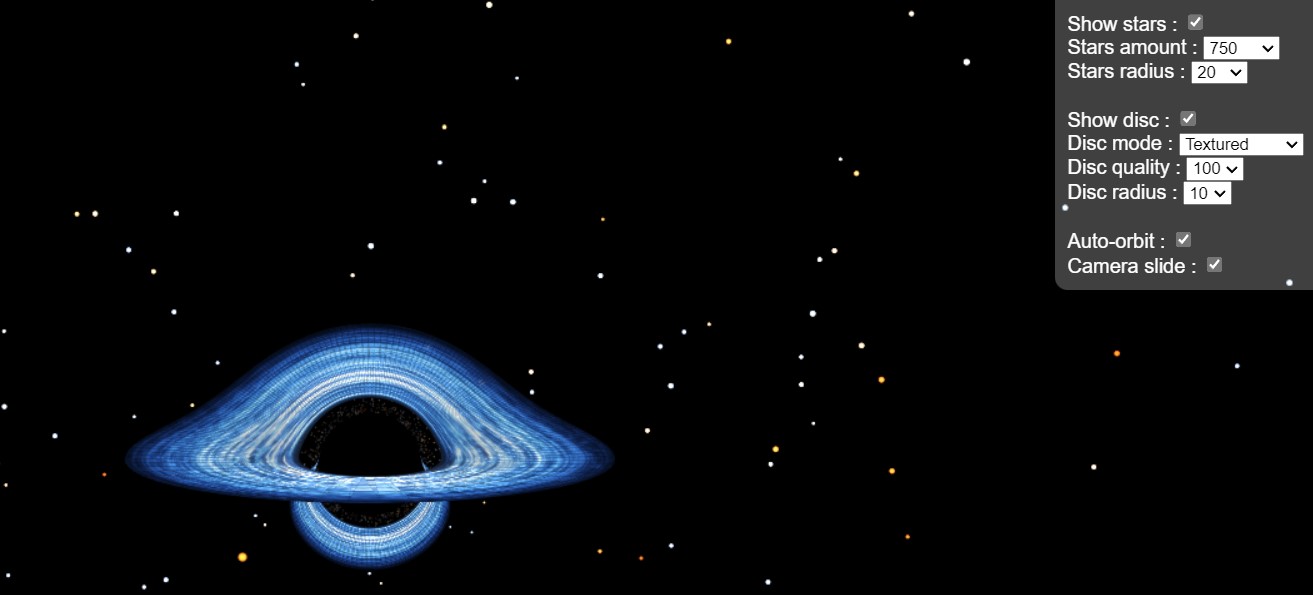 Faute de pouvoir réellement approcher un trou noir, ce site vous permet de vous déplacer virtuellement tout autour, en prenant en compte l’effet de lentille gravitationnelle.