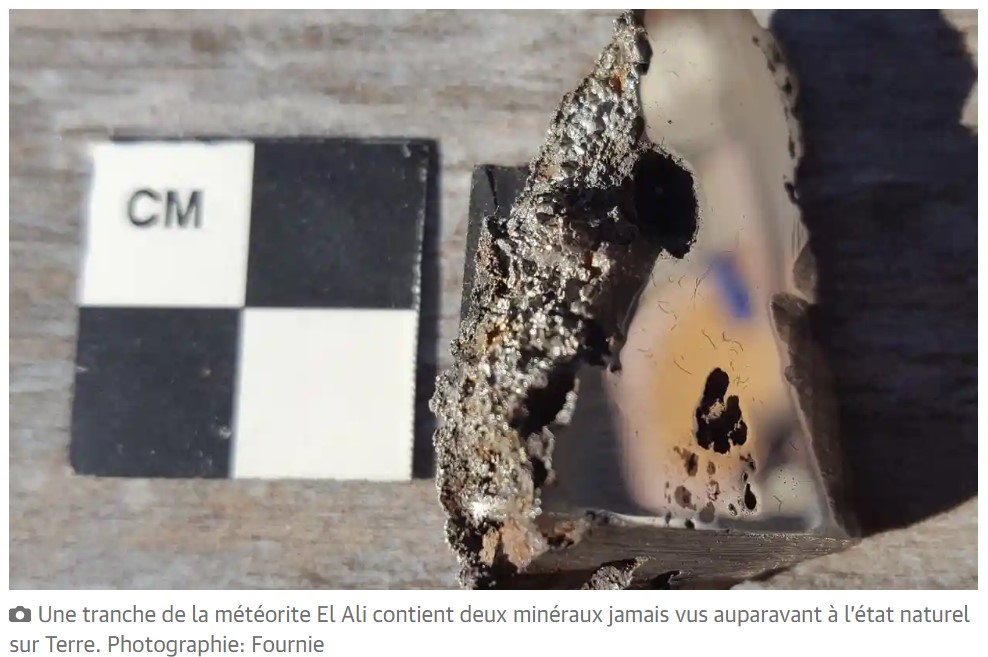 Deux "nouveaux" minéraux trouvés dans la météorite EL ALI (https://www.lpi.usra.edu/meteor/metbull.php?code=74444). Ces minéraux ont été synthétisés en laboratoire mais ne sont pas présents dans les roches terrestres.
