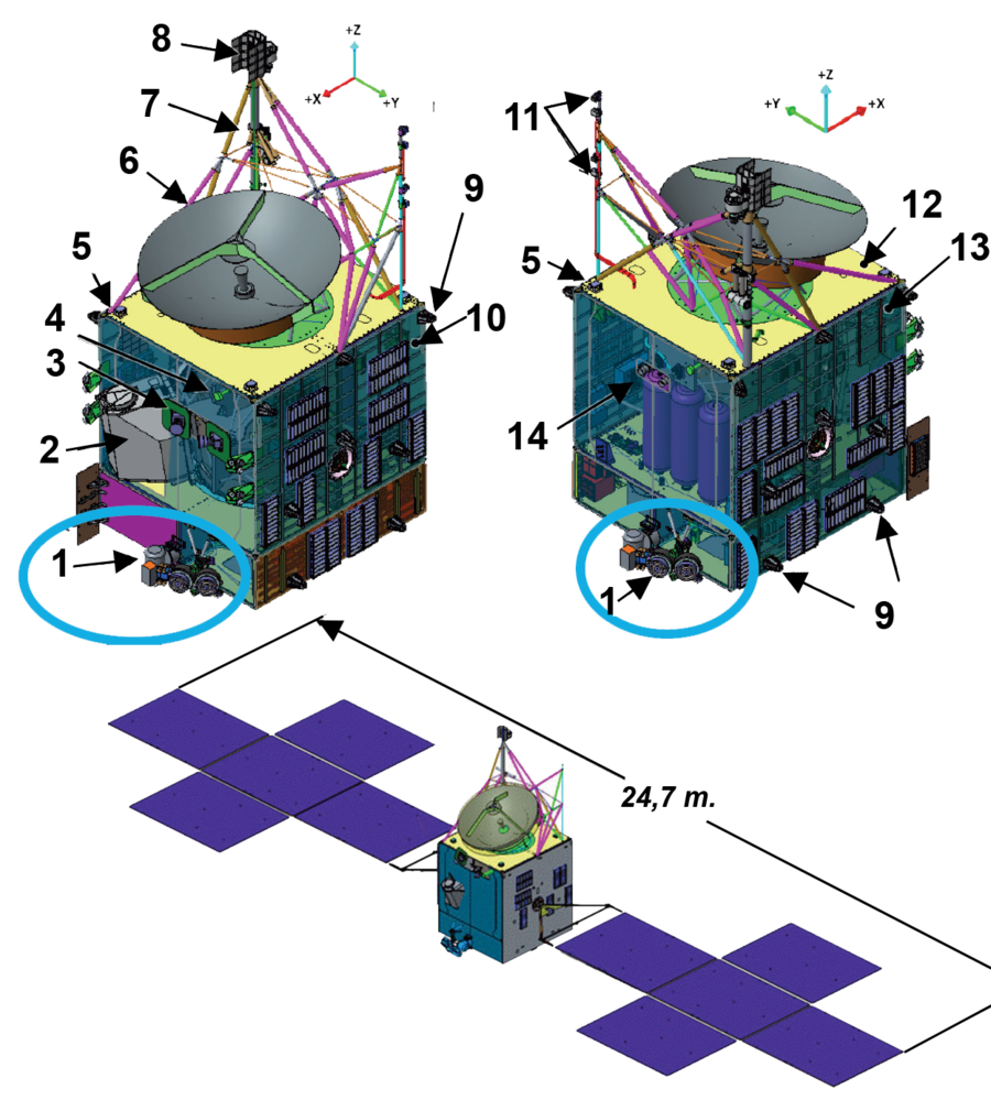 La sonde Psyché et son magnétomètre Schéma de la sonde spatiale Psyche : 1 Propulseurs à effet Hall DSM - 2 Système de télécommunications optique DSOC - 3 Viseurs d'étoiles - 4 Antenne faible gain - 5 Capteur solaire - 6 Antenne parabolique grand gain bande X - 7 Spectromètre à neutrons - 8 Spectromètre à rayons gamma - 9 Propulseurs à gaz froid - 10 Panneau -Y - 11 Magnétomètre - 12 Pont supérieur - 13 Panneau +Y - 14 Imageurs (x2).
