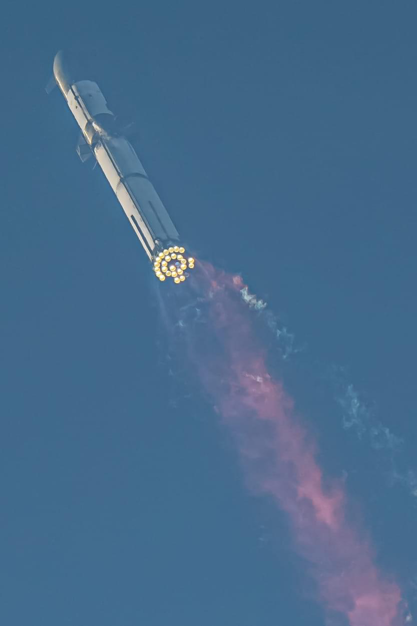 Il y a 3 moteurs que nous avons choisi de ne pas démarrer, c'est pourquoi Super Heavy Booster a décollé avec 30 moteurs, ce qui est le nombre minimum de moteurs. Les 3 moteurs n'ont pas explosé mais n'étaient tout simplement pas assez sains pour les amener à pleine poussée, ils ont donc été arrêtés.