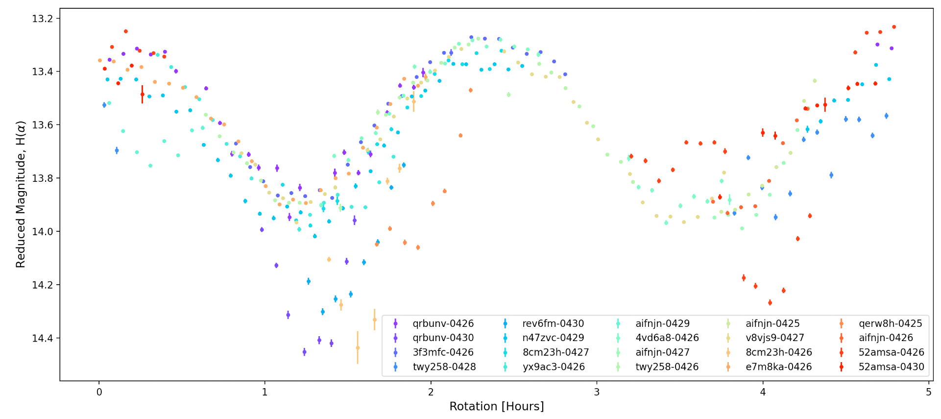 Grâce à la science participative il a été possible de regrouper différents enregistrements faits dernièrement à différents points de la Terre pour obtenir la courbe de luminosité d'IVAR ci-dessous :