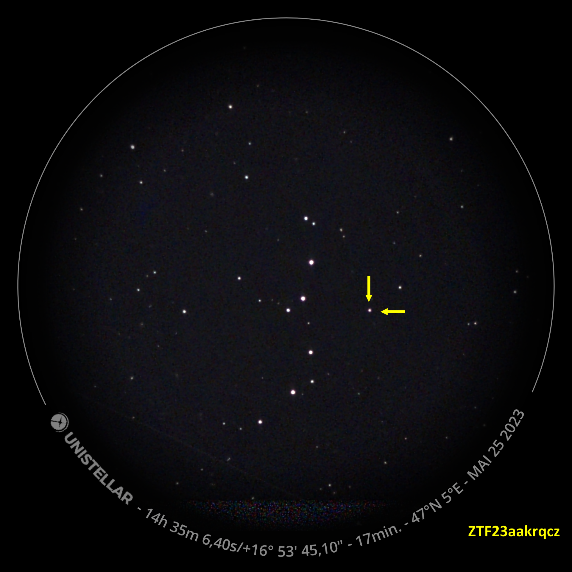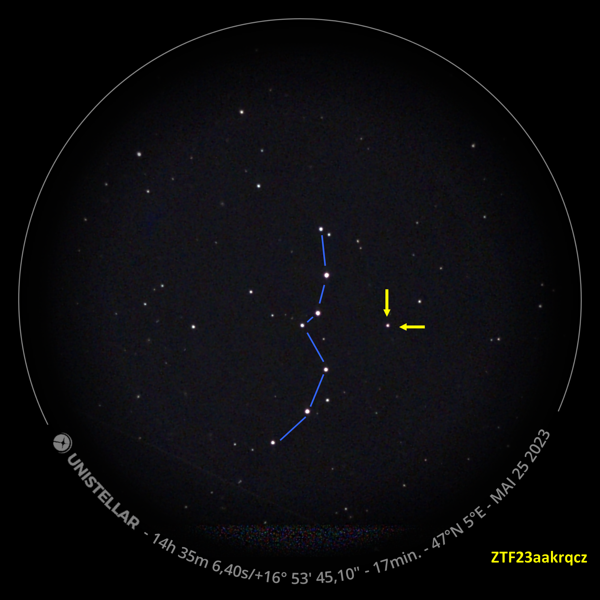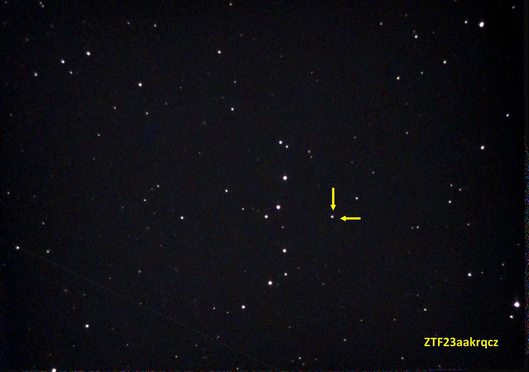 Après la découverte de SN2023ixf dans la galaxie M 101, le lendemain, le 20, une autre supernova, ZTF23aakrqcz, était découverte dans la constellation du Bouvier, vers Arcturus proche d'un astérisme en forme d'arc à double courbure.