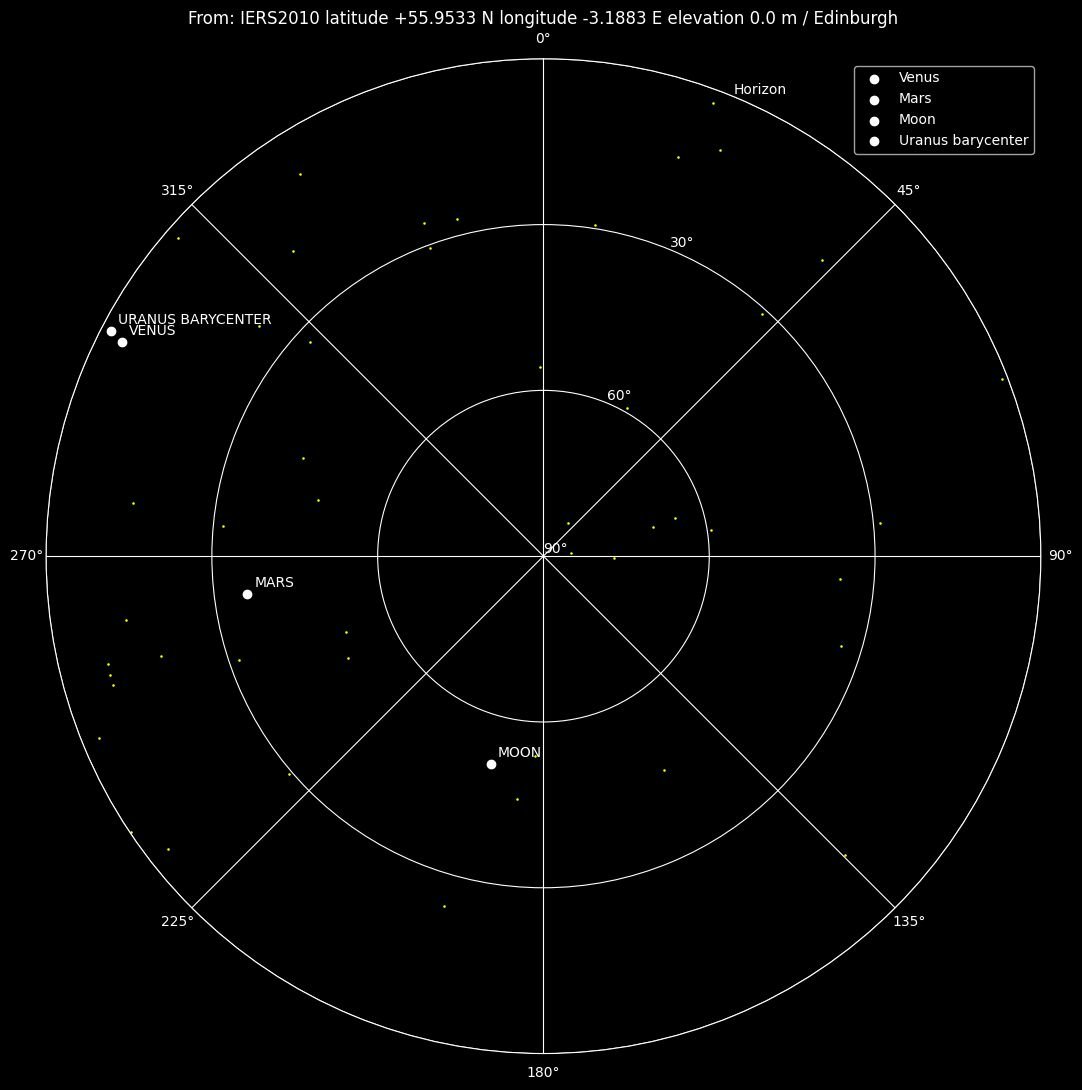 The example above shows what you can see in the sky over Edinburgh. NASA - National Aeronautics and Space Administration current-source data was used for that projection.