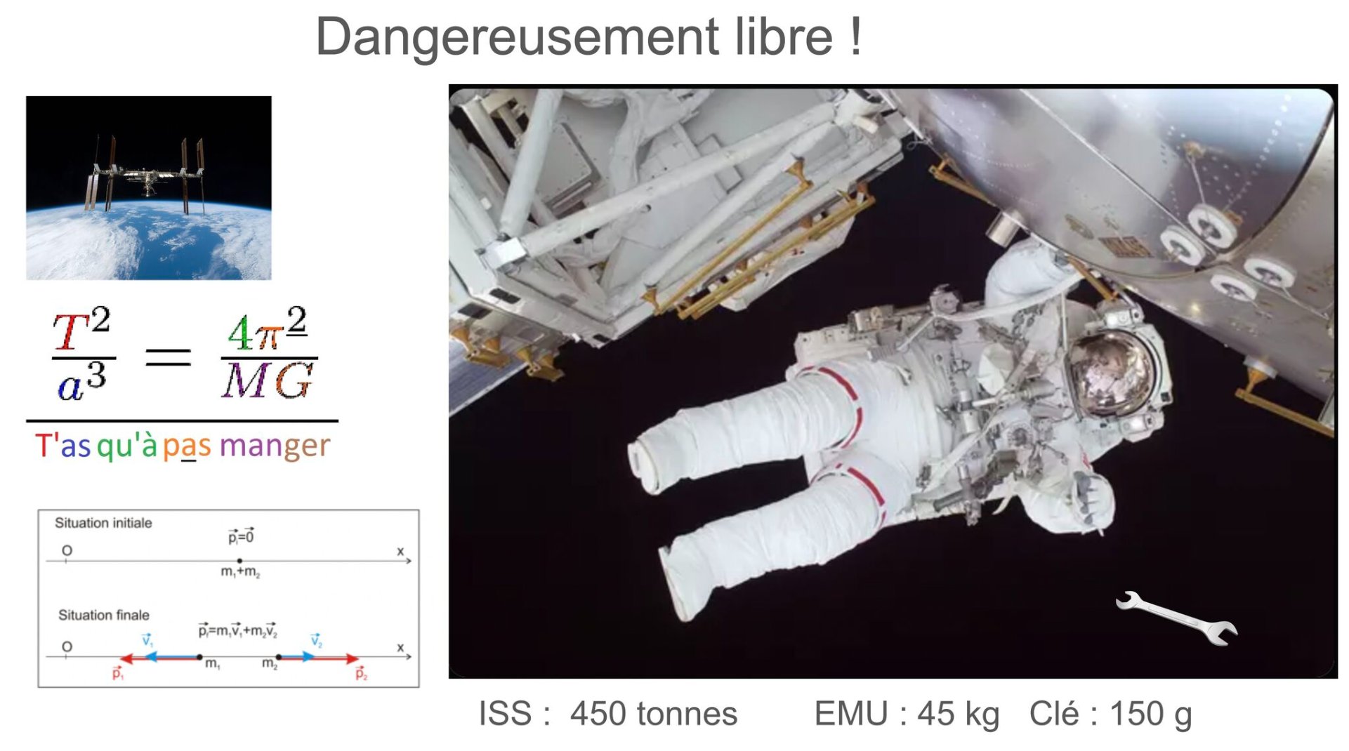 A quelle vitesse doit-il la lancer en direction opposée à l’ISS pour être sûr de ne pas dériver éternellement dans l’espace?