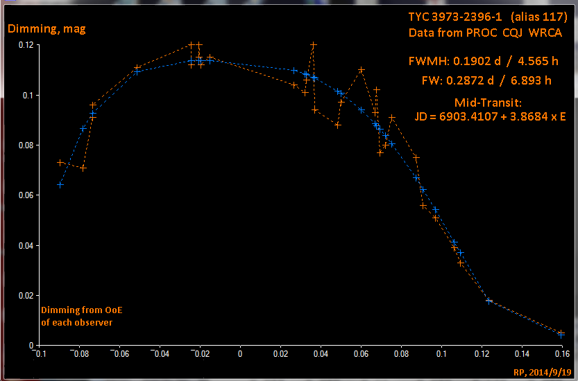 Une des comparaisons la "117" bien plus que les autres, donc c'est la coupable, vérifications... La 117 s'est bien obscurcie, soudainement. Elle semble très stable à sa nouvelle mag, étrange ? Après une paire d'heures elle retourne rapidement à sa mag normale. Pour moi ça ressemble à un transit. J'alerte mes collègues, Sebastian, l'homme aux séquences, cherche et confirme qu'elle doit bien être variable, une B pulsante lente. Cela me semble bien étrange... Un autre se manifeste et confirme qu'il a observé cette obscurcissement mais a pensé à une erreur ! Le cas du transit semble bien confirmé.