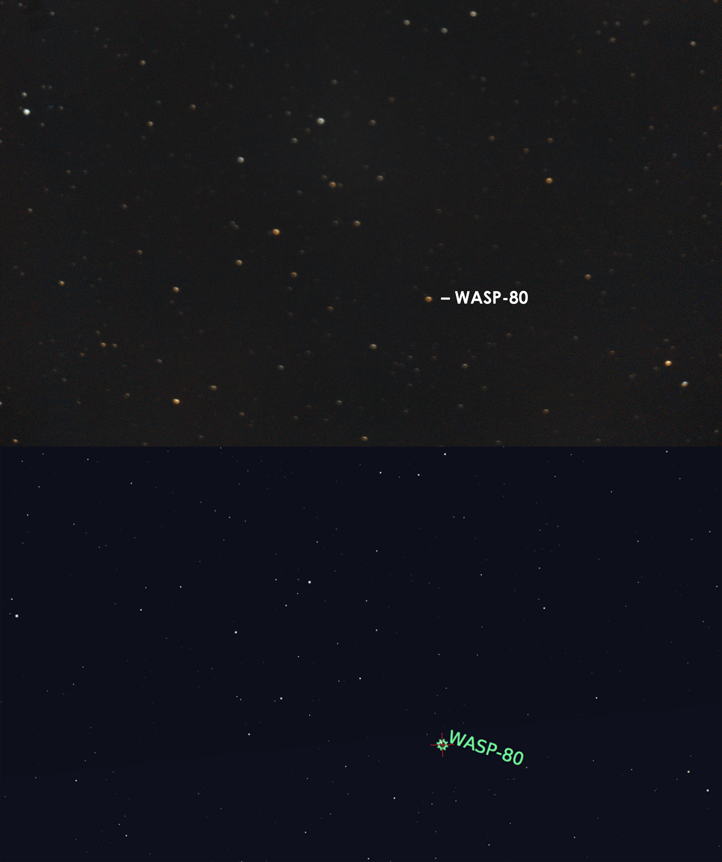 Nouveau transit d'exoplanète tenté lundi soir 15 août : WASP-80b ... mais pas réussi cette fois-ci. Bon, normal, il y avait une énorme Lune pas loin et des passages nuageux qui empêchaient des mesures photométriques correctes. Et puis, en plus, du temps perdu à repérer WASP-80b ... car je m'étais trompé dans le champ défini dans Stellarium. Oups !